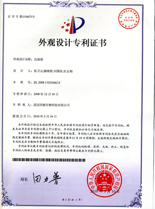 外觀設(shè)計(jì)專(zhuān)利證書(shū)(袋專(zhuān)利)