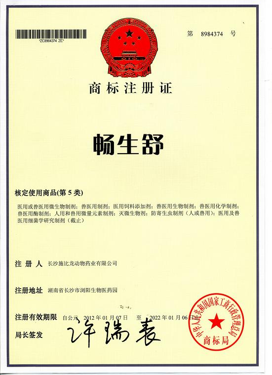 暢生舒商標(biāo)注冊(cè)證